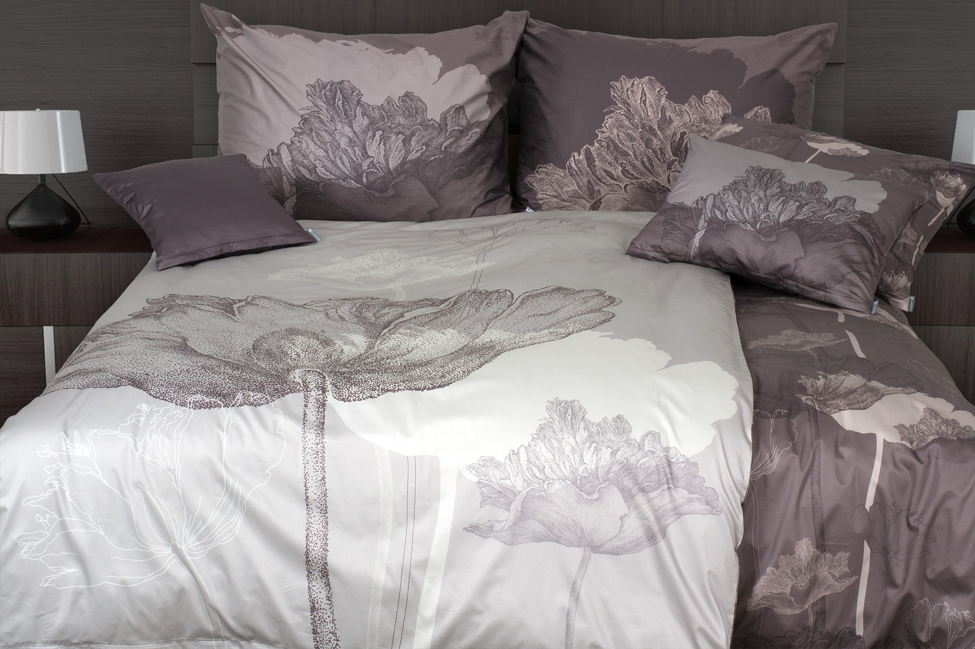 Wendebettwäsche mit großen Blumen auf hellem und dunklem Hintergrund in Graubraun. All die kleinen Zierkissen verleihen Ihrem Schlafzimmer einen luxuriösen Touch.